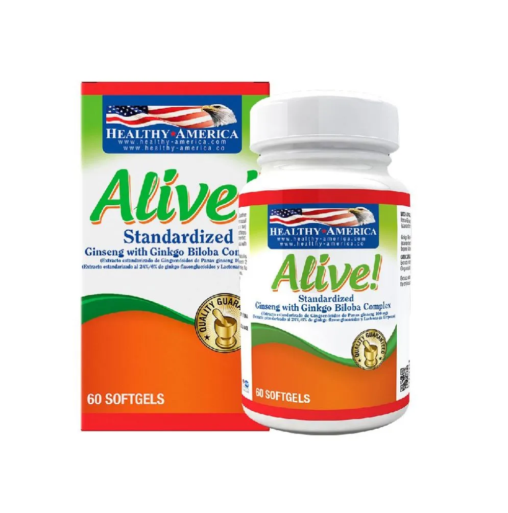 La fórmula de Alive de Healthy America combina extractos estandarizados de Panax Ginseng y Ginkgo Biloba, dos ingredientes naturales reconocidos por su aporte al bienestar cognitivo y circulatorio. El Ginseng puede ayudar a mantener niveles normales de energía física y mental y apoyar el metabolismo energético. El Ginkgo Biloba contribuye a la circulación y la oxigenación, lo que favorece la función cerebral y puede ayudar a la memoria y el estado de alerta.